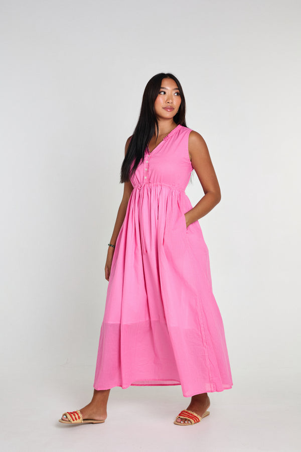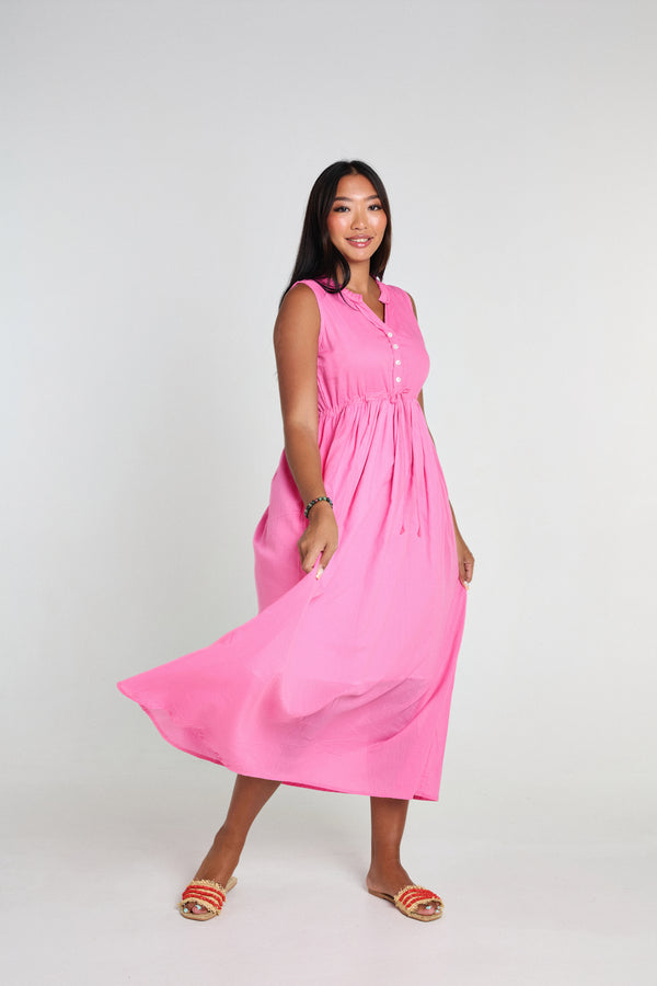 Our gorgeous Isabel dress from our SUNDAR collection is certainly that one style you want as part of your wardrobe!! Flattering pleated V-neckline with button down design and a drawstring waist for added shape. Finished with hidden side pockets. complete the look with you favourite...